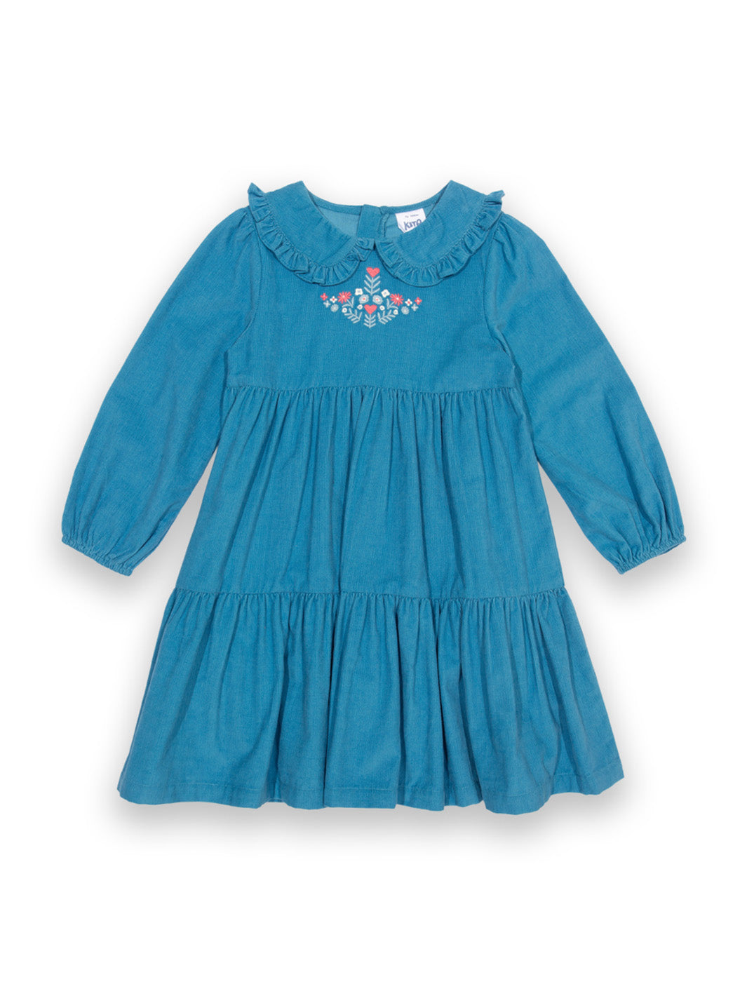 Spin for days in this gorgeous French blue dress! Made from soft organic corduroy fabric, it features a tiered skirt for lots of twirl and swirl. Complete with pretty flower and heart embroidery, a frill dolly collar and elasticated cuff sleeves, this dress offers effortless, head-turning style.