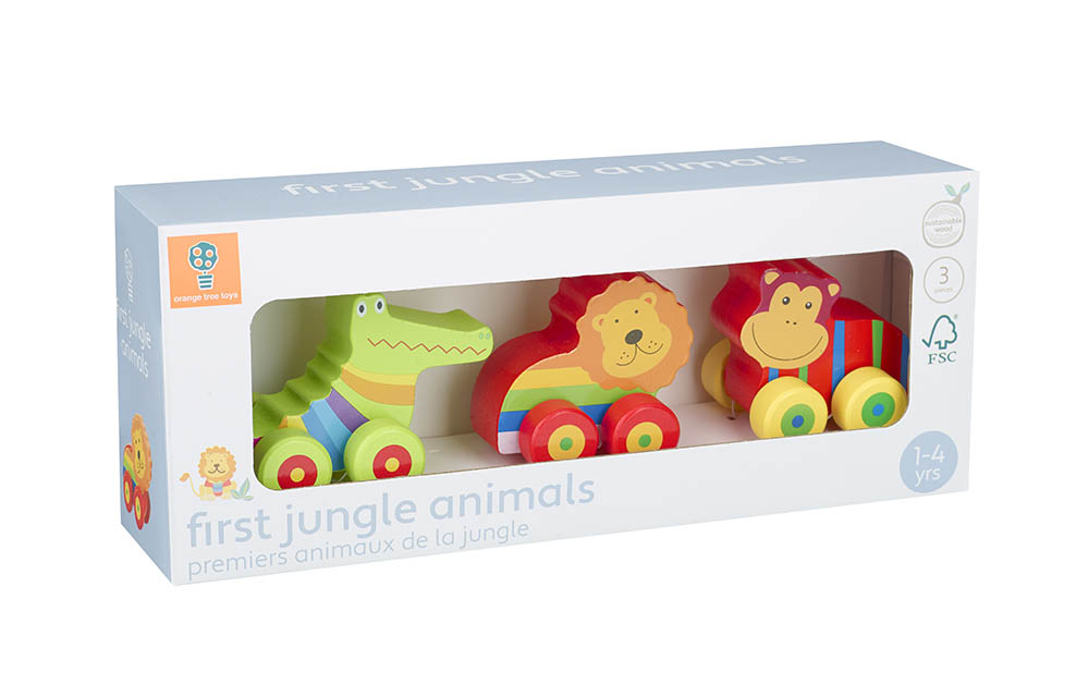 Introduce your little one to the wild wonders of the jungle with the Orange Tree Toys Wooden First Jungle Animals on wheels set. This delightful trio features a colourful crocodile, majestic lion and a playful monkey, all perfectly sized for little hands to grasp and explore. Each animal rolls smoothly on sturdy wooden wheels, making them ideal for endless push-and-pull fun. These jungle friends are designed to spark imagination and inspire creative story telling. This jungle set is a wonderful way to nurture early development, play curiosity, encourage social play and help develop key motor skills