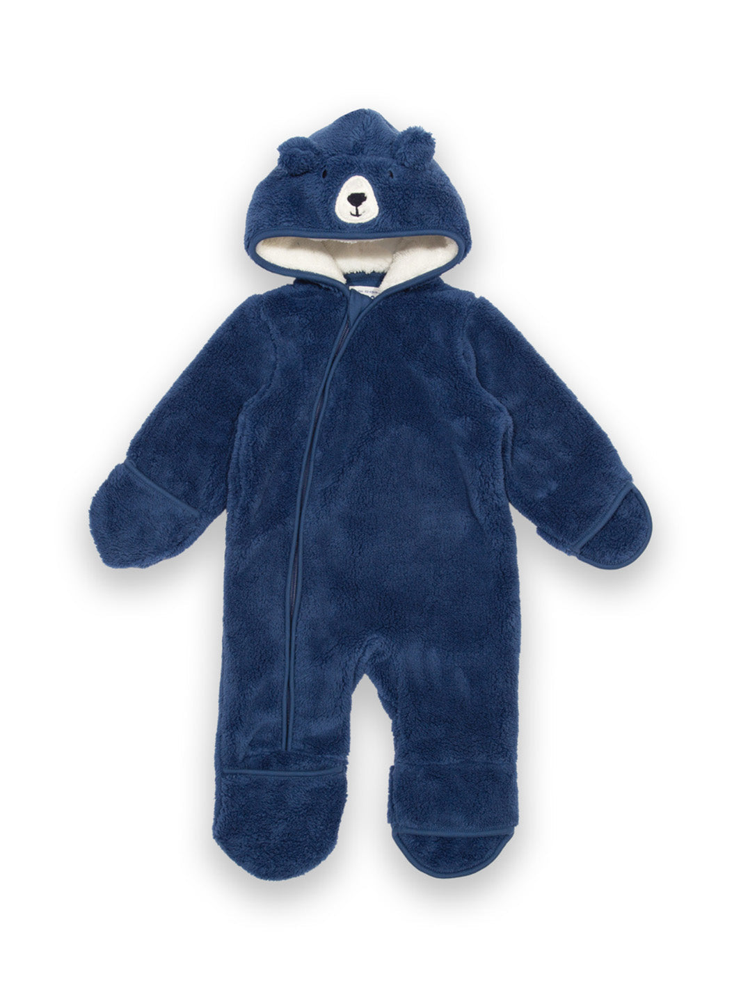 Made in a gorgeously soft navy fleece fabric featuring our Mr Bear appliqué face design on the hood. The turn-over mitts and feet (or rib leg cuffs for sizes 12-18m and 2y) and an asymmetrical zip to the ankle mean this all-in-one is easy to pop on and off, just the thing for when your little one needs a soft and comfy extra layer.