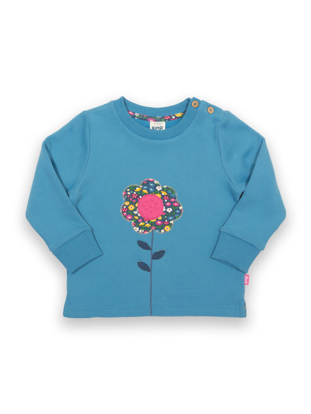 Fantastically floral! This gorgeous Kite sweatshirt in cornflower blue features our signature flower appliqué, showcasing our woodland print. It's the perfect companion to pair with our woodland leggings and makes a great layer for every adventure. Made from 100% organic cotton with coconut button should opening up to and including age 3 y for easy changing.