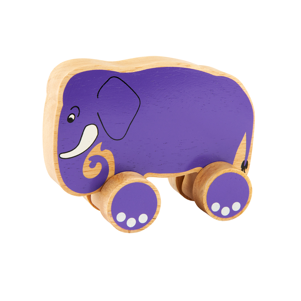 A chunky wooden toy purple elephant push along. This colourful elephant is handcrafted from sustainable rubber wood and is perfect for small world play.